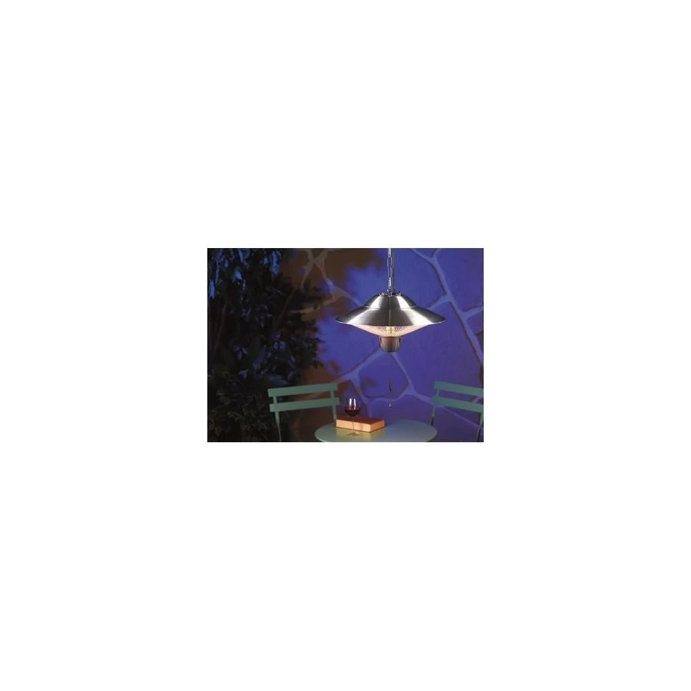 Intensité réglableProfitez d’une chaleur agréable sur votre terrasse : cette lampe radiante est conçue pour les espaces couverts extérieurs : terrasse couverte, mais aussi kiosque, préau ou maison de jardin. Vous pouvez ainsi prolonger leur utilisation même en hiver ou lors des soirées un peu fraîches.Il suffit de suspendre l’appareil au plafond et de le brancher à une prise électrique. Le système de chauffage infrarouge diffuse immédiatement une chaleur agréable, idéal lorsque vous ne devez sortir que quelques minutes.Lampe chauffante extérieure infrarouge pour une chaleur ciblée et immédiate, par SemptecJusqu’à 5 000 heures de fonctionnementPortée : jusqu’à 2 mètres env.Grille de protection pour une utilisation en toute sécuritéConçu pour une utilisation dans un espace couvert uniquementLampe inamoviblePuissance réglable 1500 W ou 600 WDimensions (Ø x H) : 425 x 290 mm, chaîne de fixation 50 cmAlimentation : 230 V, câble 195 cm Inclus : chaîne de fixation et 2 mousquetons