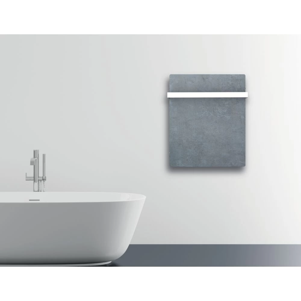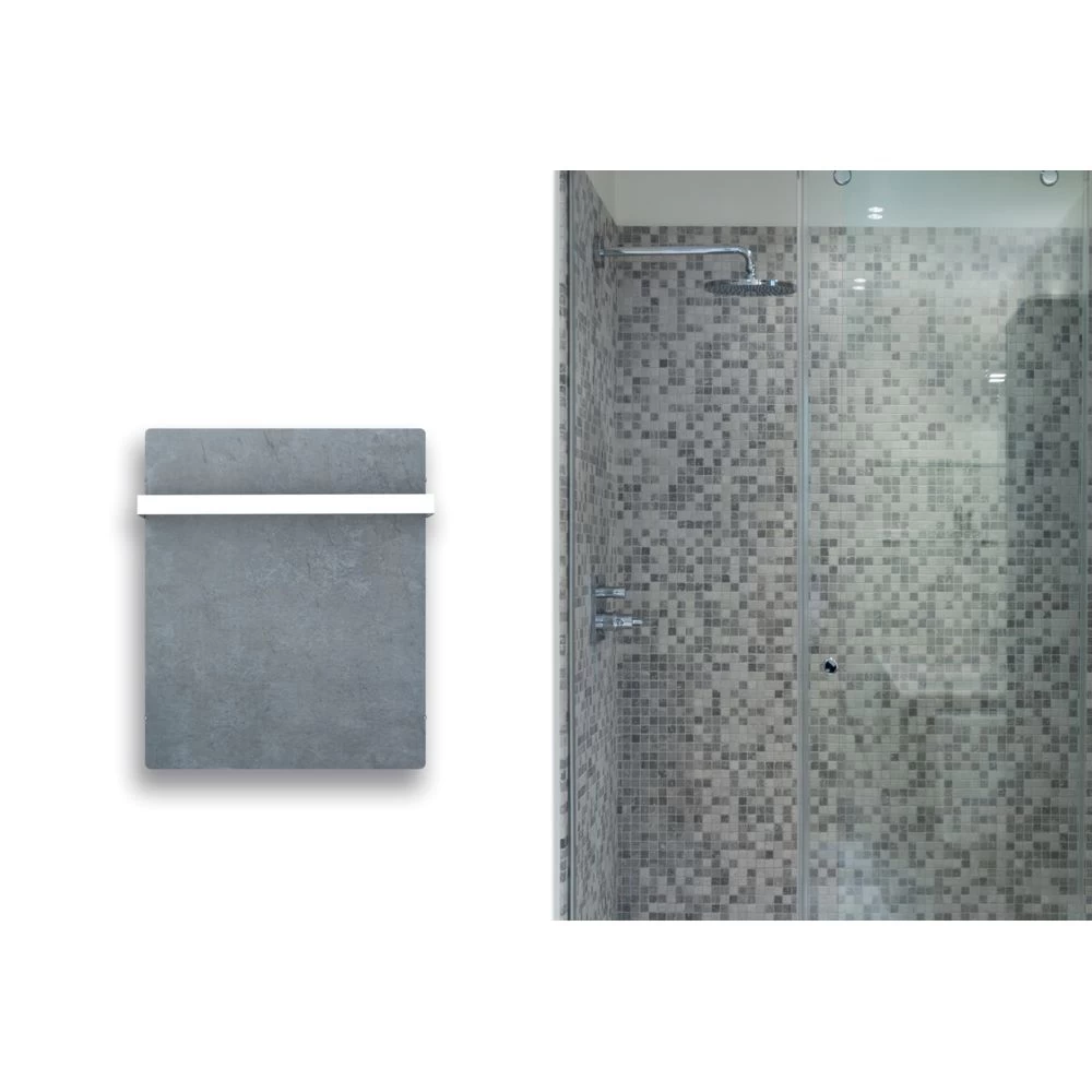 Seche-serviettes à inertie TERRA 1000w vertical 50x60cm, façade pierre naturelle. Avec une barre porte-serviettes en acier inox. Programmable, FP 6 ordres, fonction fenêtres ouvertes, mode hors-gel.
