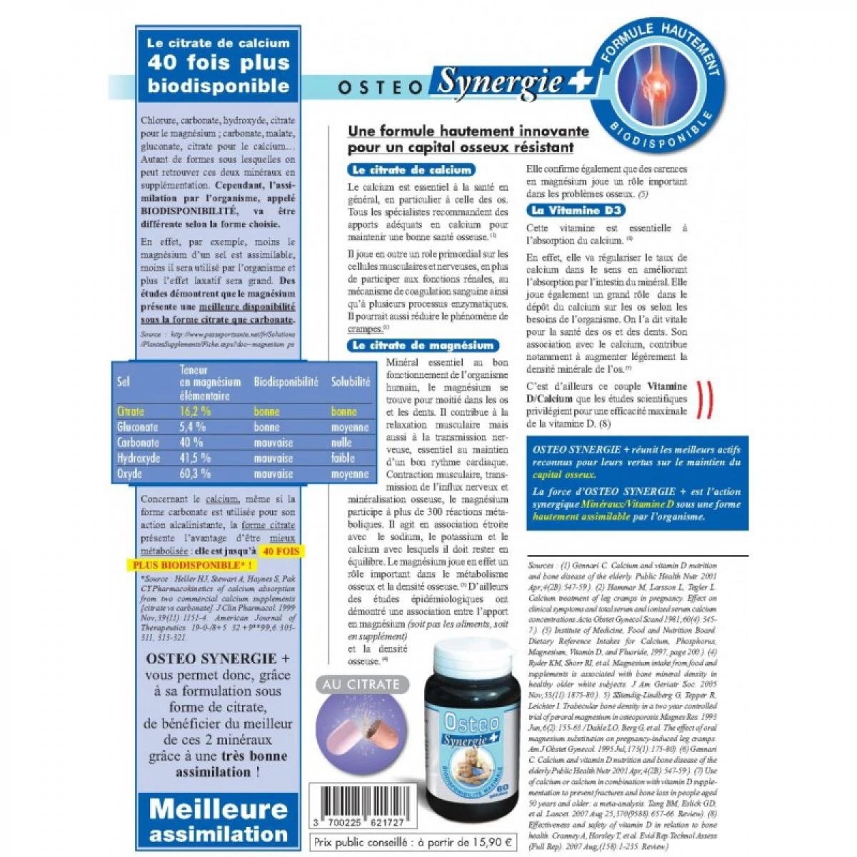 OSTEO SYNERGIE + est association unique de Magnésium et de Calcium sous leur forme la plus biodisponible, le citrate, associé à la vitamine D.