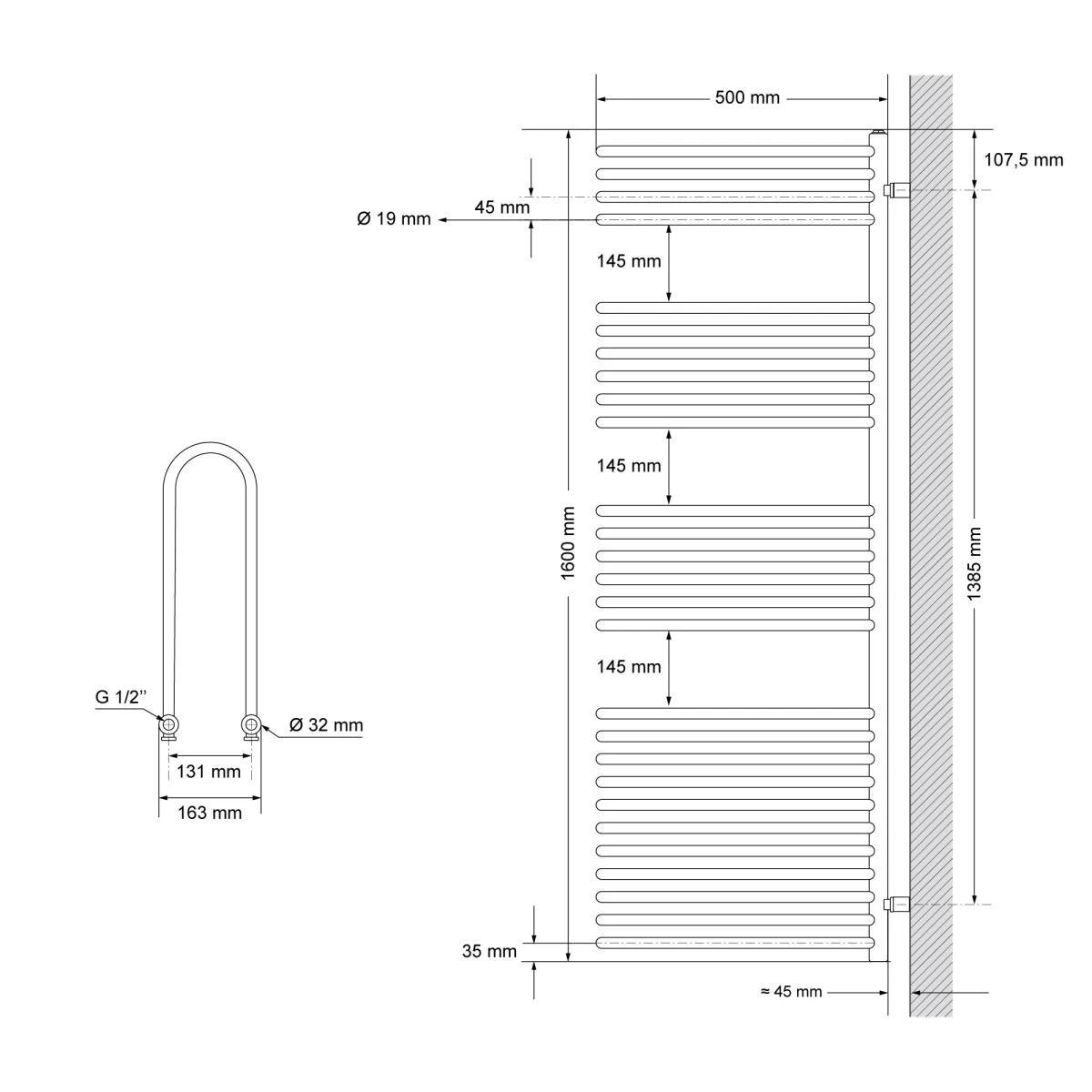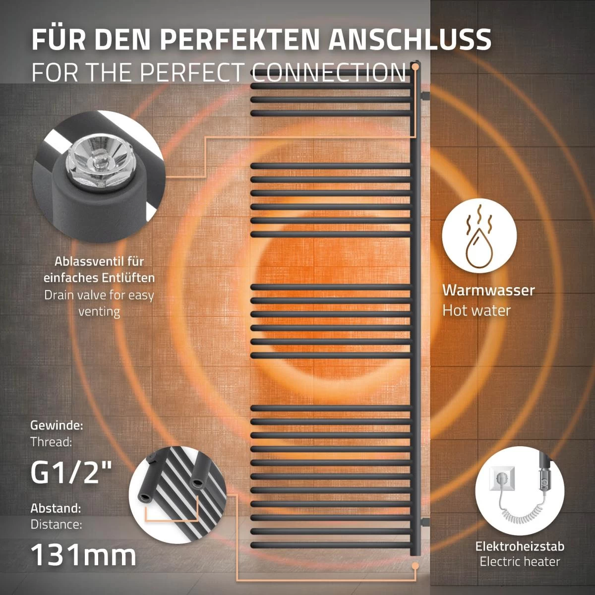 Les radiateurs anthracite conviennent parfaitement à la salle de bains, mais peuvent également être utilisés dans d’autres pièces. Même si les radiateurs sont prévus pour être utilisés avec un thermoplongeur, ils peuvent être raccordés au système de chauffage central. Le matériel de montage correspondant est fourni dans la même couleur.