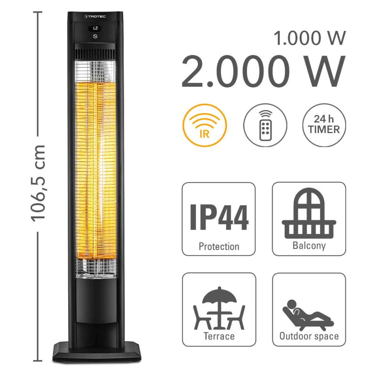 Points forts Trotec TROTEC Chauffage infrarouge de terrasse sur pied IRS 2010 E, 2000 W, chauffage de terrasse, chauffage d’extérieur, colonne, tour, chauffage d’appoint
