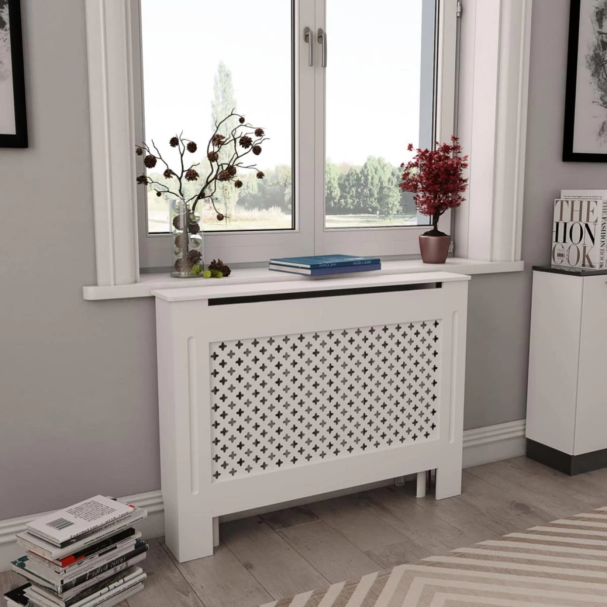 Ce cache-radiateur sera un supplément élégant et pratique à votre salon. Il est conçu pour donner à votre radiateur une fonction décorative et un espace additionnel pour les cadres photo, les livres, les ornements, etc. Fabriqué en MDF de qualité, le cache-radiateur est robuste et durable. Il a un design moderne à lattes qui convient à tous les décors et est facile à assembler.